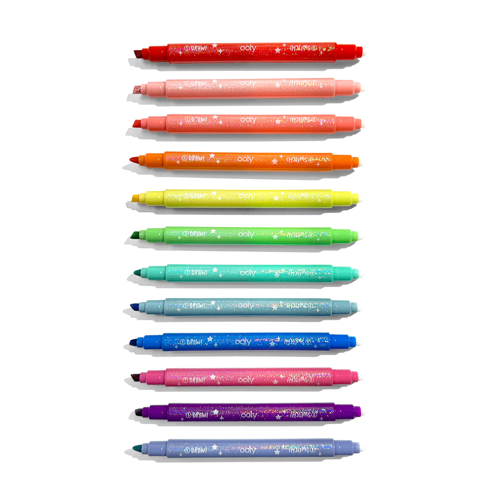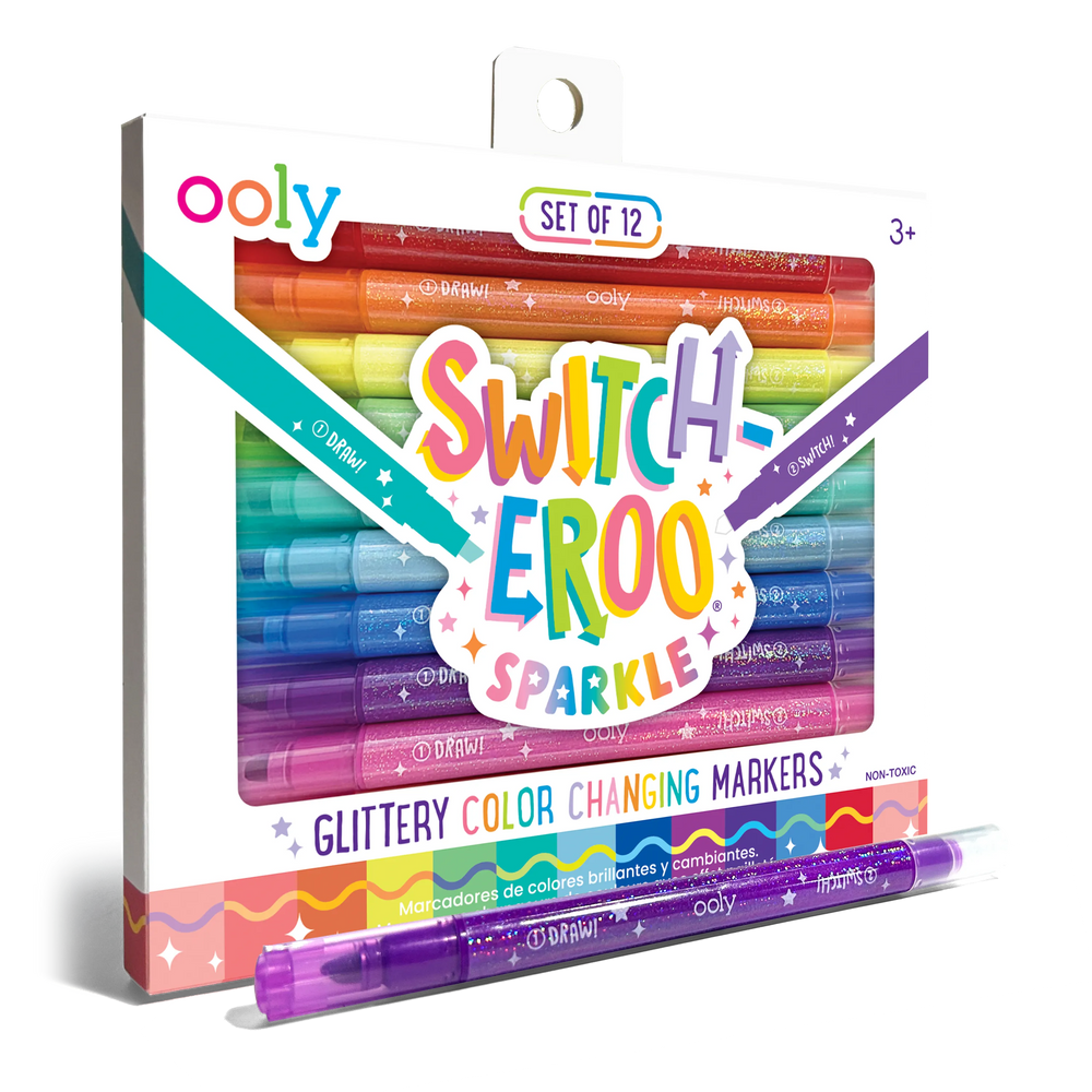 Add some sparkle to your creations with the Switch-Eroo Sparkle Glittery Color Changing Markers! This set of 12 color changing markers combines vibrant glittery hues with an exciting surpriseâeach marker is double-ended, featuring a dazzling glittery color on one side and a surprise mystery color on the other. Use the glitter side to add shimmer and shine, then flip the marker to reveal a secret shade to totally switch up the shade and switch up your design. These glitter markers are ready for all your creative endeavors - decorating cards, personalizing notebooks, or making school projects stand out.