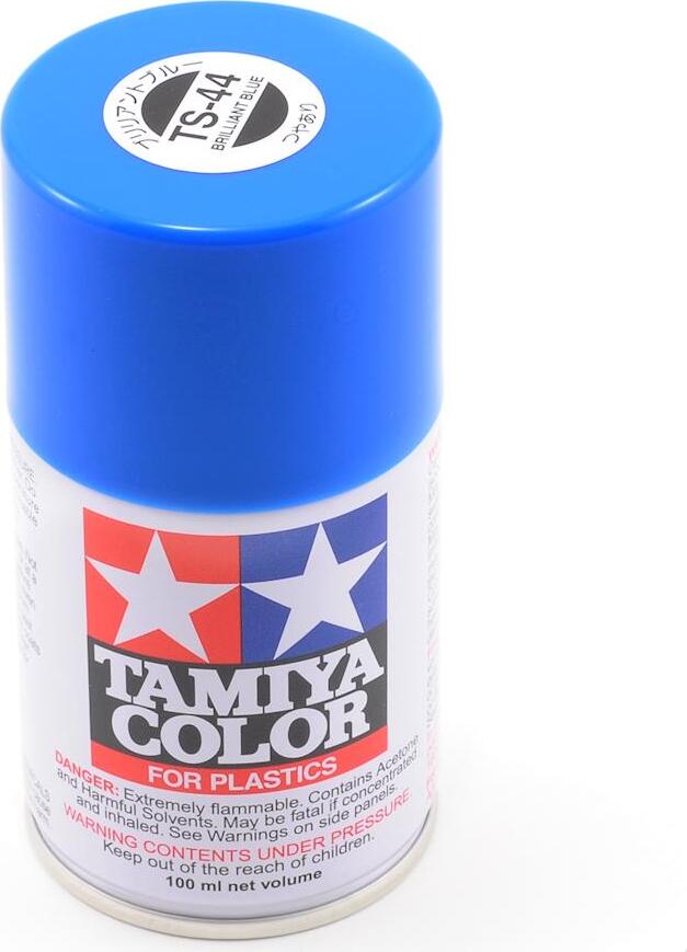 Tamiya Color TS-44 Brilliant Blue Spray Paint works well on wood, styrofoam and most common model plastics. Paint is a synthetic lacquer and can holds enough paint to cover 2 or 3 standard car models. Ages 14 and up. Made in Japan. 100 ml (3.38 ounce) spray can. ATTENTION: This product contains chemicals known to the State of California to cause cancer, birth defecTS- or other reproductive harm.