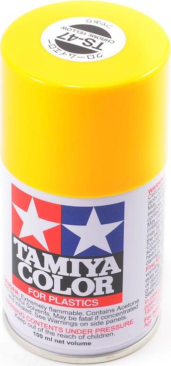 Tamiya Color TS-47 Chrome Yellow Spray Paint works well on wood, styrofoam and most common model plastics. Paint is a synthetic lacquer and can holds enough paint to cover 2 or 3 standard car models. Ages 14 and up. Made in Japan. 100 ml (3.38 ounce) spray can. ATTENTION: This product contains chemicals known to the State of California to cause cancer, birth defecTS- or other reproductive harm.