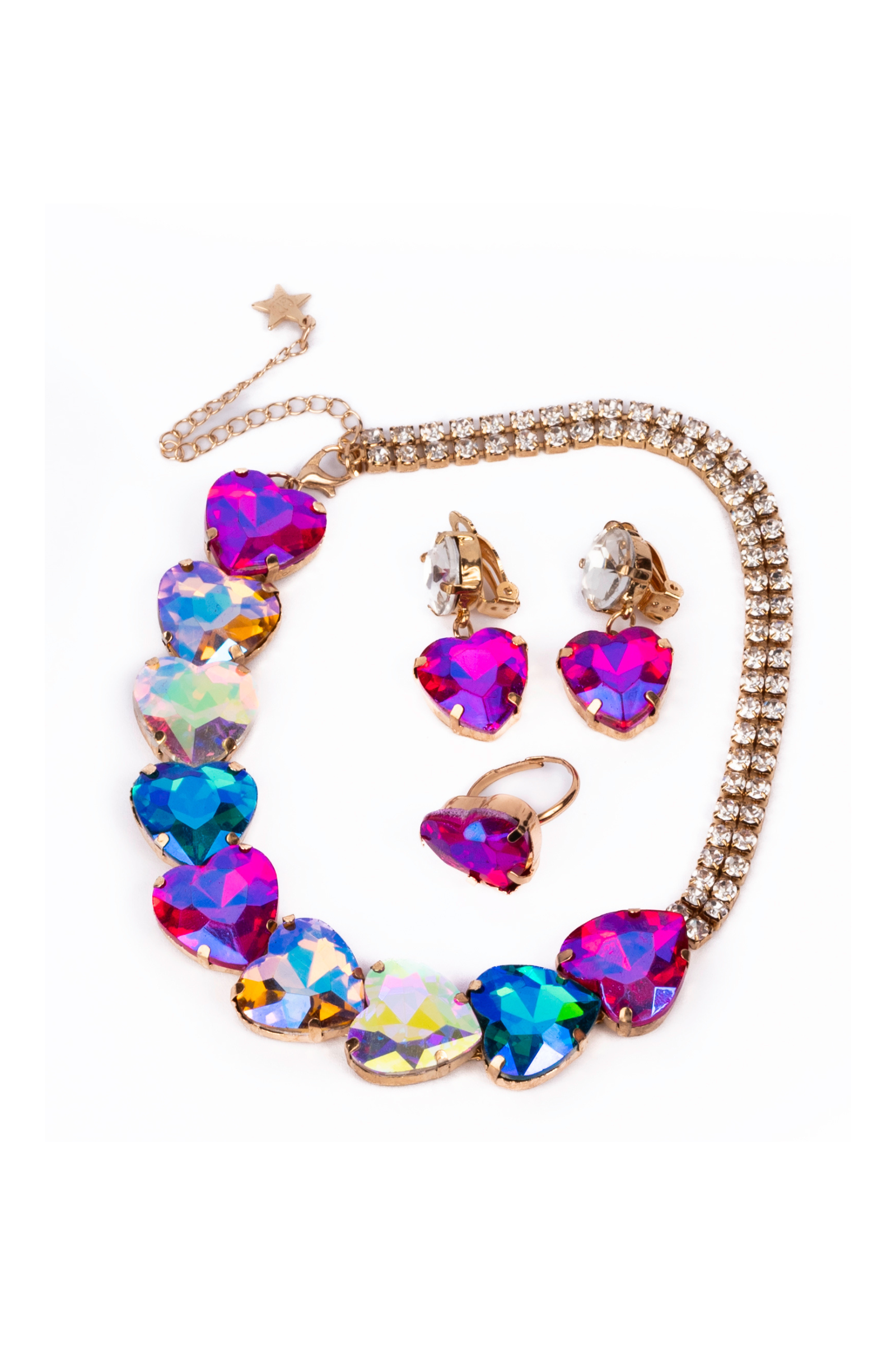 Introducing The Aurora—a stunning jewelry set that captures the essence of elegance and charm! This exquisite collection features a beautiful necklace adorned with vibrant purple, blue, and clear heart-shaped gemstones, creating a dazzling display. The set also includes matching clip-on earrings and a charming ring, perfect for adding a touch of glamour to any outfit. The Aurora makes a wonderful gift for special occasions or a delightful treat for little ones who love to shine!