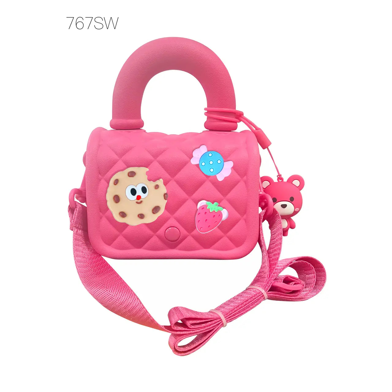 This Hot Focus Tiny Mini Charm Crossbody (Sweets) is an adorable, candy-themed, kid-friendly purse featuring durable material, an adjustable strap, and removable charms.