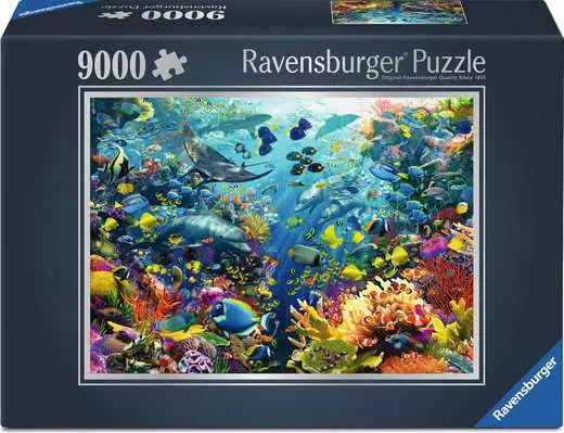 Dive deep into puzzle nirvana where vibrant tropical fish swim among colorful coral in this ultra-challenging âUnderwater Paradiseâ 9,000-piece puzzle!