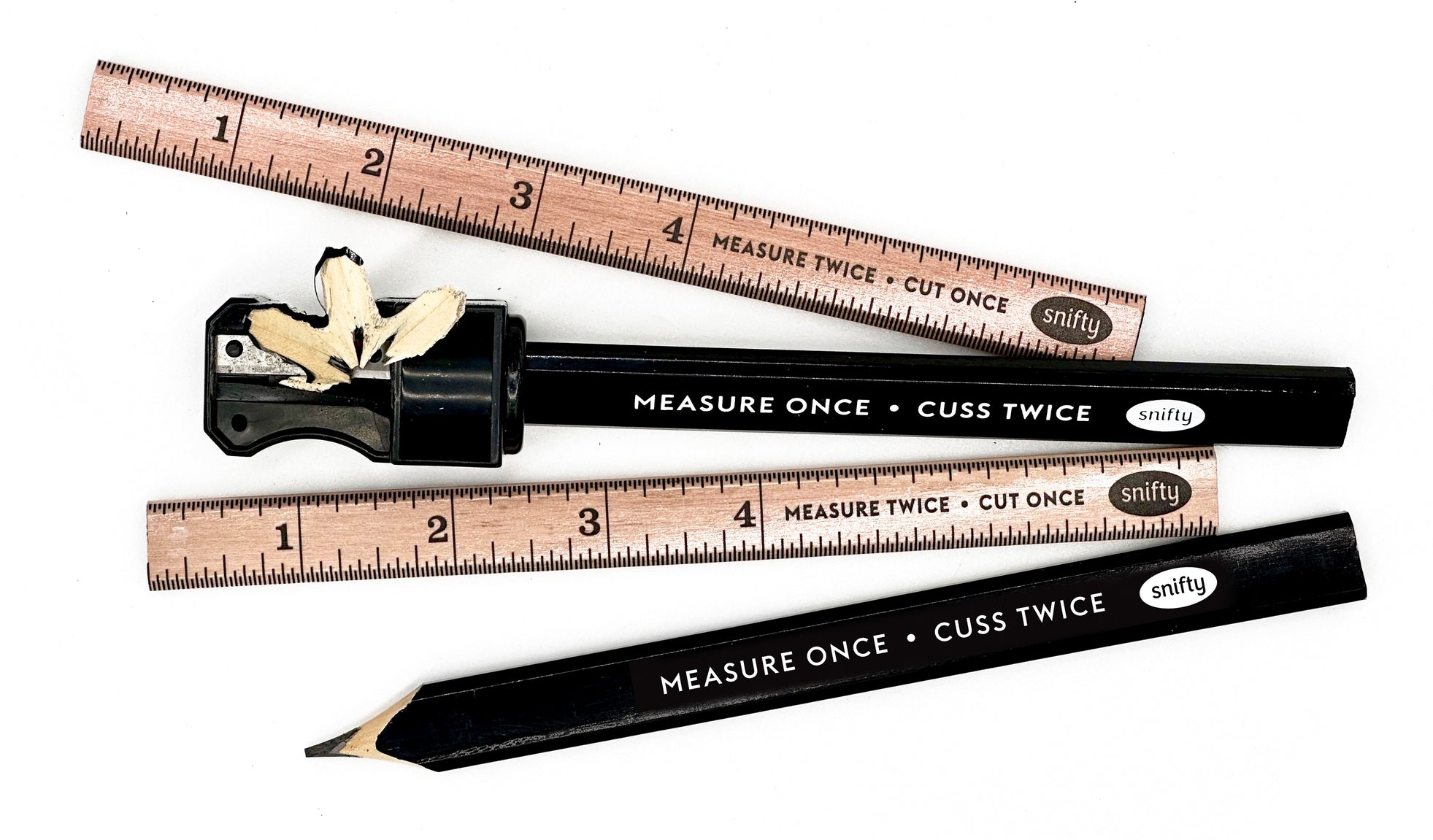 No knife needed! The witty carpenter pencils sharpen easily with the included jumbo sharpener. Wood + Work Carpenter pencil & sharpener set makes the perfect gift for dads, brothers, uncles ... all those hard to shop for folks. Set of 8 pencils (4 black / 4 natural) + sharpener